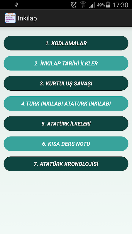 Bu uygulamada KPSS inkılap tarihi konuları ile ilgili olarak inkılap pratik ders notu, inkılabın şifreleri olan inkılap kodlamaları inkılap ilkleri ve konu anlatımları bulunmaktadır. Bunlar