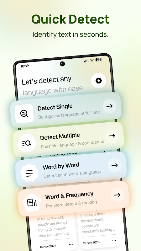 語言偵測器透過顯示語言、單字結構和視覺模式,幫助您更深入地理解文字。它簡單、清晰,是日常學習和探索的實用工具。