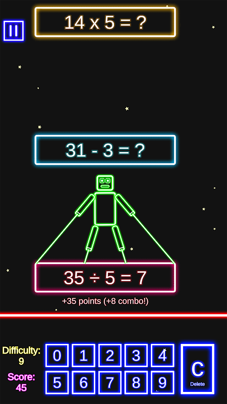 激光數學是一款以激光和霓虹燈為主題的數學遊戲。 它是專為求和,減法,乘法和除法而設計的。