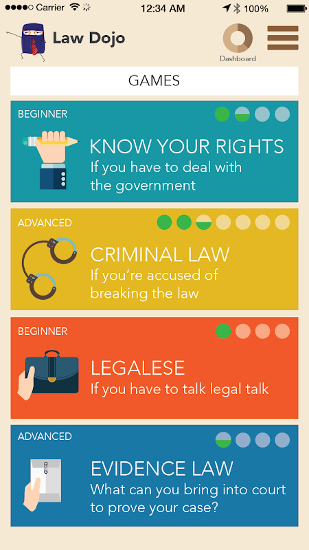 Law Dojo is not just for law students. Play Know Your Rights to know what you can and can’t do when interacting with government officials. Also, there’s LSAT vocabulary tests for those prepping to take the law school entrance exam, there’s driving law for people about to apply for a driver’s license, and there’s Law School Bootcamp for those who want to get a taste of what awaits at law school.