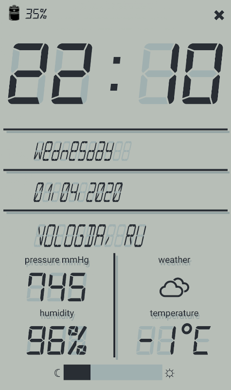 這是一個很棒的夜鐘。它們重複了舊的LCD顯示器的功能。時鐘顯示天氣,溫度(攝氏度或華氏度),濕度和壓力。那些也是氣象站。當您點擊屏幕時,時鐘會發音時間,星期幾和日期。您可以調整屏幕的亮度。這將使時鐘真正每晚發生。按下時,手錶會發出舊電子產品的聲音。