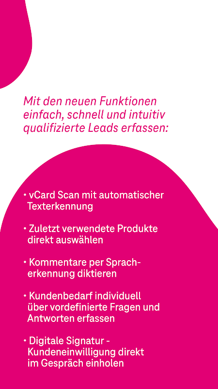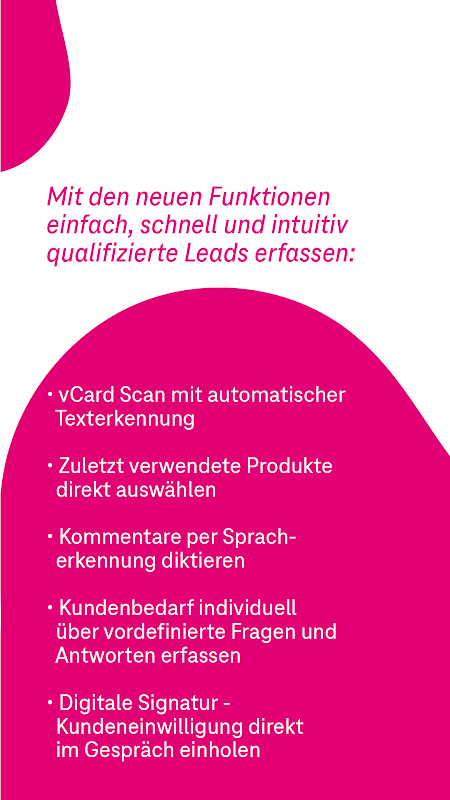 Die Anwendung richtet sich an Berater der Telekom und von T-Systems sowie an Partner der Telekom. Mit Hilfe einer App-unterstützten Checkliste werden Kundengespräche automatisch um den jeweiligen Beratungskontext ergänzt und können reibungslos in CRM-Systeme integriert werden.