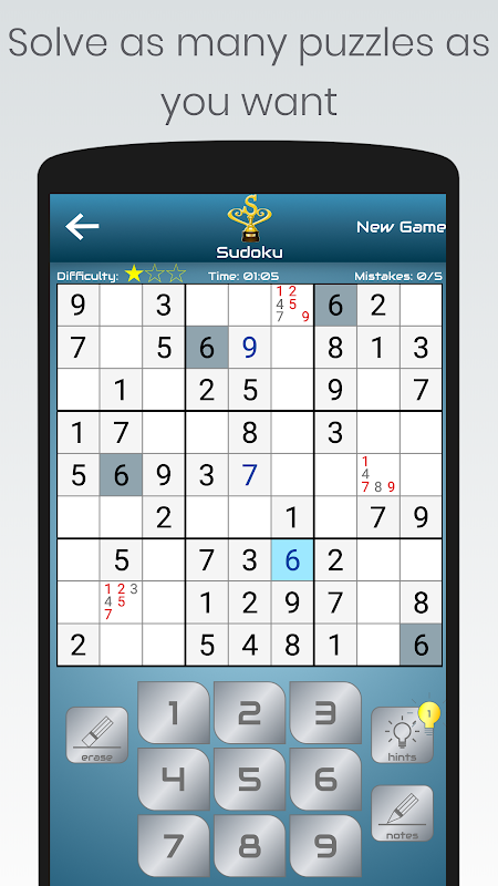 1.經典的9x9數獨遊戲(輕鬆 - 中等難度級別):玩家可以根據他們的難度級別選擇數獨遊戲,解決他們想要的數量的數獨遊戲,並查看他們的數獨遊戲統計數據。玩家可以隨時重置這些數獨遊戲統計數據。