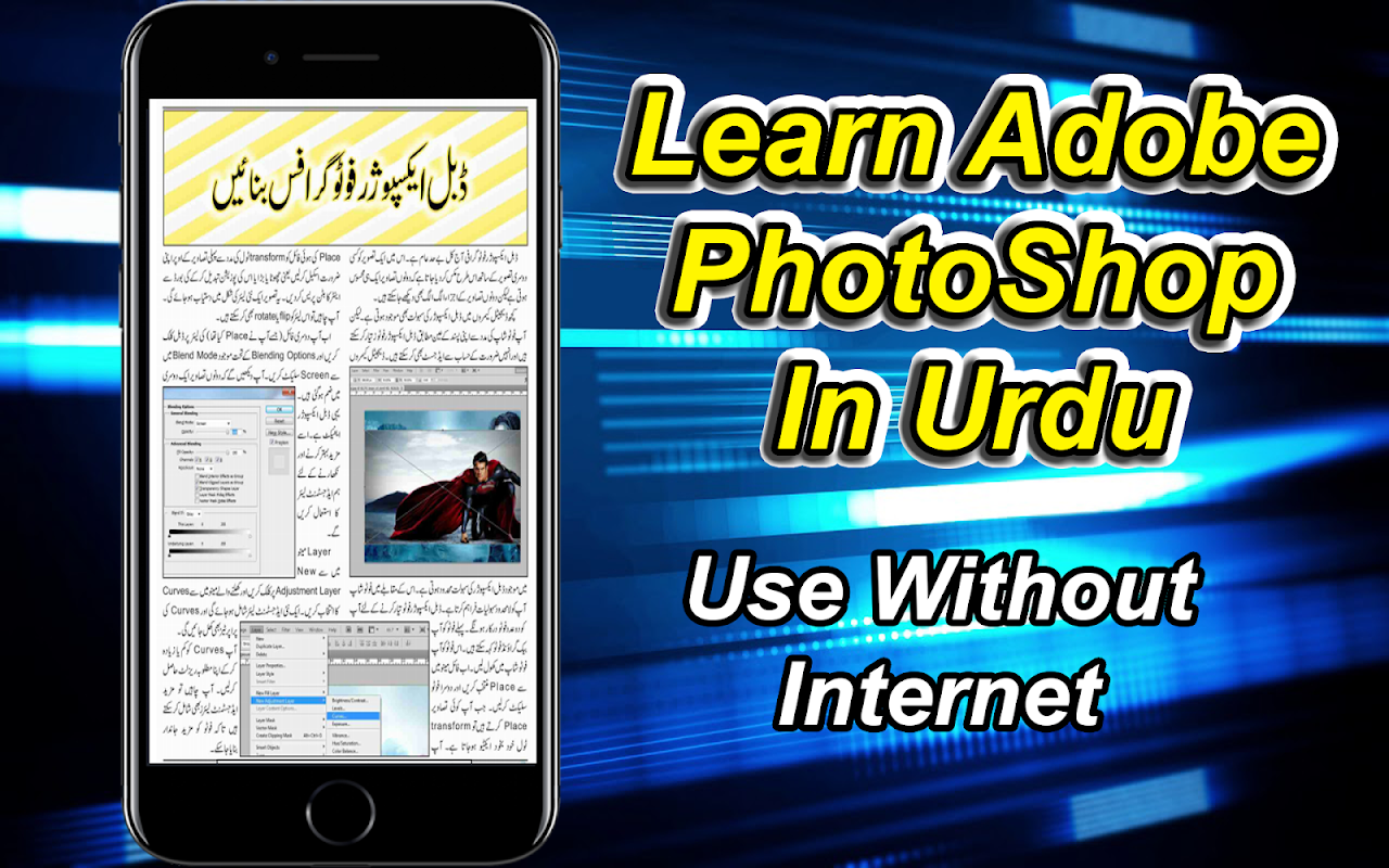 Learn Adobe Photoshop in Urdu provide photoshop tutorials from basic to advanced,This beautiful app has been designed for everyone who wants to learn photoshop and its tricky tools. This app will guide all photoshop beginners in urdu to start designing in no time. this tutorial contains step by step in the form of images, so easy to understand to the user of this application. This app contains basic tutorials, photo effects, text effects .Professional level photoshop course in Urdu/Hindi (Basic to Advance level). The best photoshop course ever...