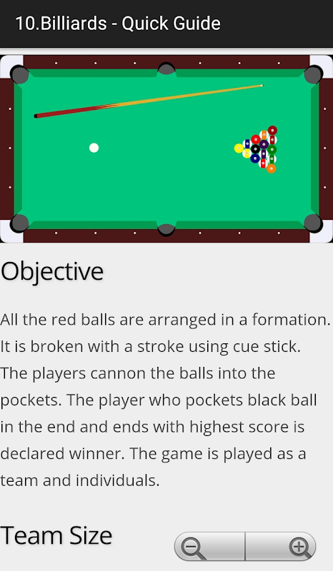 Billiards is a game that can be compared to the game of carom. In this game cue is used as a striker and balls are to be put into the pockets. This Learn Billiards App lets you know about the game, its rules, and the method of playing.