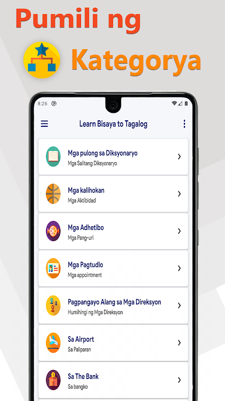 您可以在許多類別中找到短語,例如,如果您想知道今天的醫生坐在哪裡,那麼您會找到一個類別(在醫生那裡),在該類別中,您將找到有關該醫生的短語。如果您每天給此應用15分鐘,則可以輕鬆學習Bisaya。