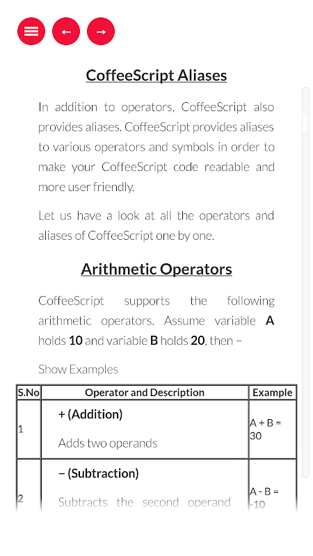 此應用程序包括適用於初學者的 CoffeeScript 的所有基本概念以及適用於專家的高級和中級概念。