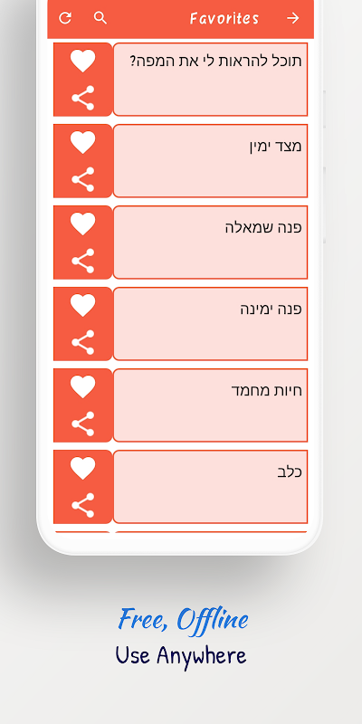 初學者學習希伯來語應用程序有 27 個不同的部分。它們是~學校、工作、動物、運動、面試、審訊、常用句子、酒店、日期、問題、餐廳、汽車、顏色、數字、醫生、方向、交通、身體、時間、感情、市場、旅行和自然,介紹、天氣、占星術、問候和購物。這些類別足以滿足您在這些情況和地方需要學習的大多數句子。