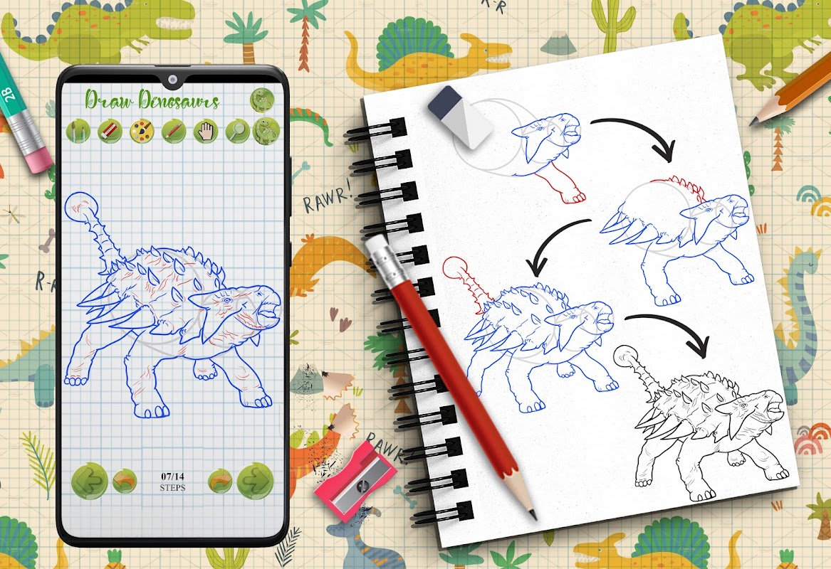 學習如何畫恐龍從未如此簡單!您可以選擇直接在手機屏幕上繪畫,讓您隨時隨地練習。或者,拿起鉛筆和素描本,按照應用程序的說明在紙上創建令人驚嘆的恐龍插圖。