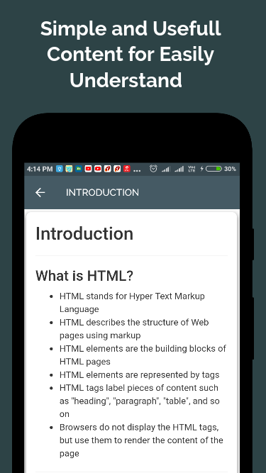 Learning is process a never ends so make a app for people who want learn things by yourself .The app provide to learn HTML language by yourself. The simple and easy language used to everybody understand.The app provide a example to better understand on individual topic which is make to improve quick learning for everybody.
