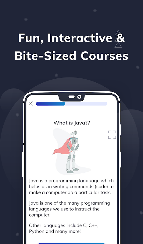 您可以準備 Java 開發人員面試或破解 Java 編碼測試以進行軟體測試。它是一款一站式學習應用程序,包含簡短的課程、程式碼範例、教學課程和用於運行程式碼的編譯器。您可以編寫程式碼並檢查輸出。課程結束時,您也可以參加 Java 測驗或測驗。