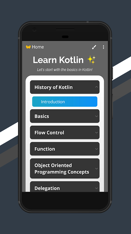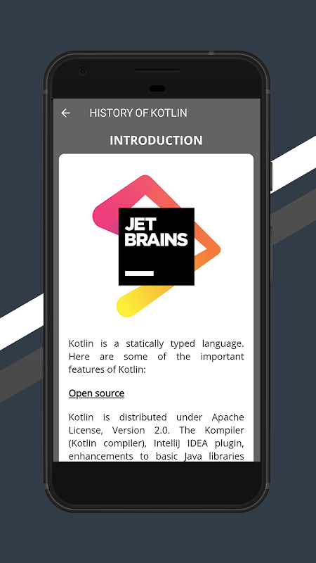 This app covers all the important parts of Kotlin and it's created to improve the thinking of varied issues in regards to the basics of Kotlin programming. It consists of relevant subjects and their syntax and source code.
