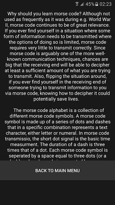 Learn morse code today - one of history's most powerful communication systems - by using this complete tool. Begin with an introduction on morse code that gives you a good understanding of how and why morse code is used right from the start and test your skills in the challenging "Quiz" mode to further cement your morse code knowledge through repetition exercises.