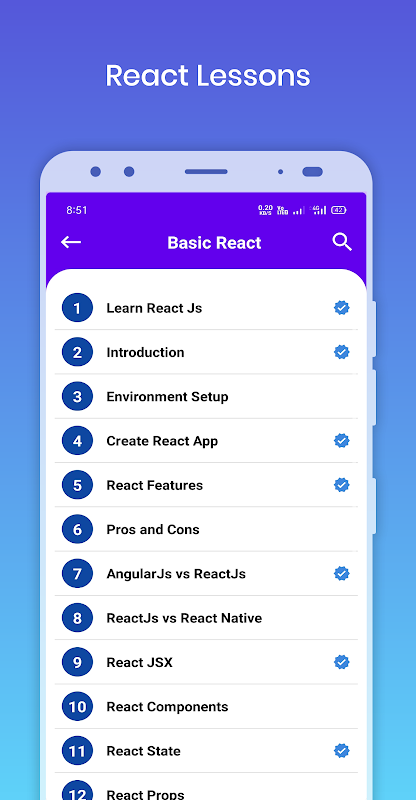 Learn React JS 是一款免費應用程序,可讓您輕鬆學習 React 並試用其實時項目。您可以使用該應用程序逐步學習 React 教程,使用 React 解釋器在每節課上試驗代碼,以及更多地從初級到高級學習 React 的基本概念。