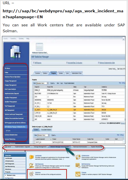 SAP Solman, Tutorial, Overview, Features, Work Center, Work Center Structure, Implementation, Infrastructure, Operations, System Landscape Information, Guided Procedure Authoring, Template Management, Test Management, IT Task Management, Change Control Management, Incident Management, Service Desk, Business Process Operations, Application Operations, Maintenance Management, Upgrade Project, Root Cause Analysis, Reporting, Consultant Responsibilities.