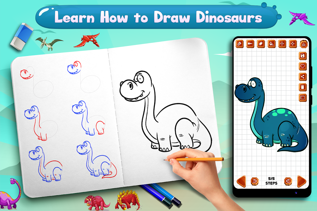 Learn to Draw Dinosaurs is perfect app for those who want to be an artist and love drawing cute dinosaurs. This App teaches you how to draw cute kawaii dinosaur in simple steps and improve your confidence of drawing and coloring.