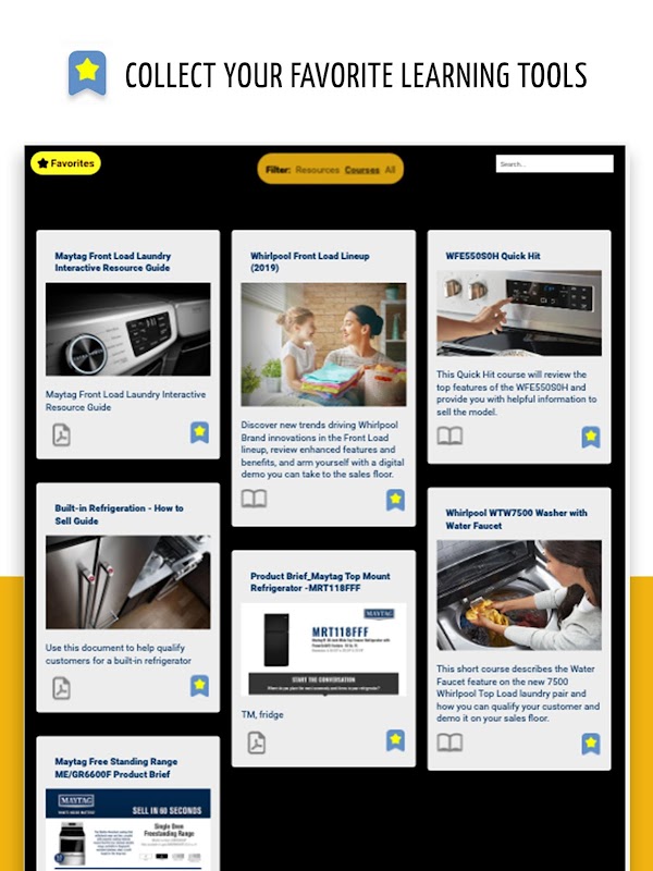 獲取關於KitchenAid®,Maytag®和Whirlpool®品牌的設備的所有最新,功能齊全的內容。我們的“智能搜索”工具使您能夠快速瀏覽所提供的所有培訓內容,而我們的“收藏夾”功能使您能夠收集資源並離線保存以供查看。