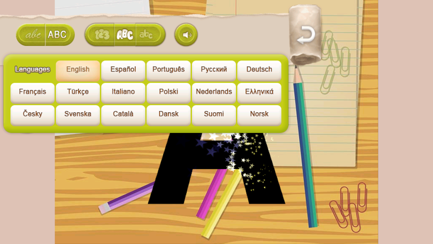 - Menu, sounds, alphabet and numbers available in 17 languages: English, Spanish, Portuguese, Russian, German, French, Turkish, Italian, Polish, Dutch, Greek, Czech, Swedish, Catalan, Danish, Finnish, Norwegian.