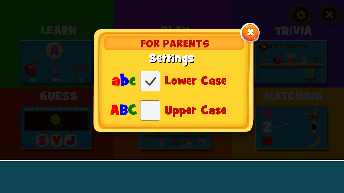 - 猜想拼音:兒童需要選擇從懸掛板上的正確音/字母或對象以匹配在上板中示出的對象或音聲。