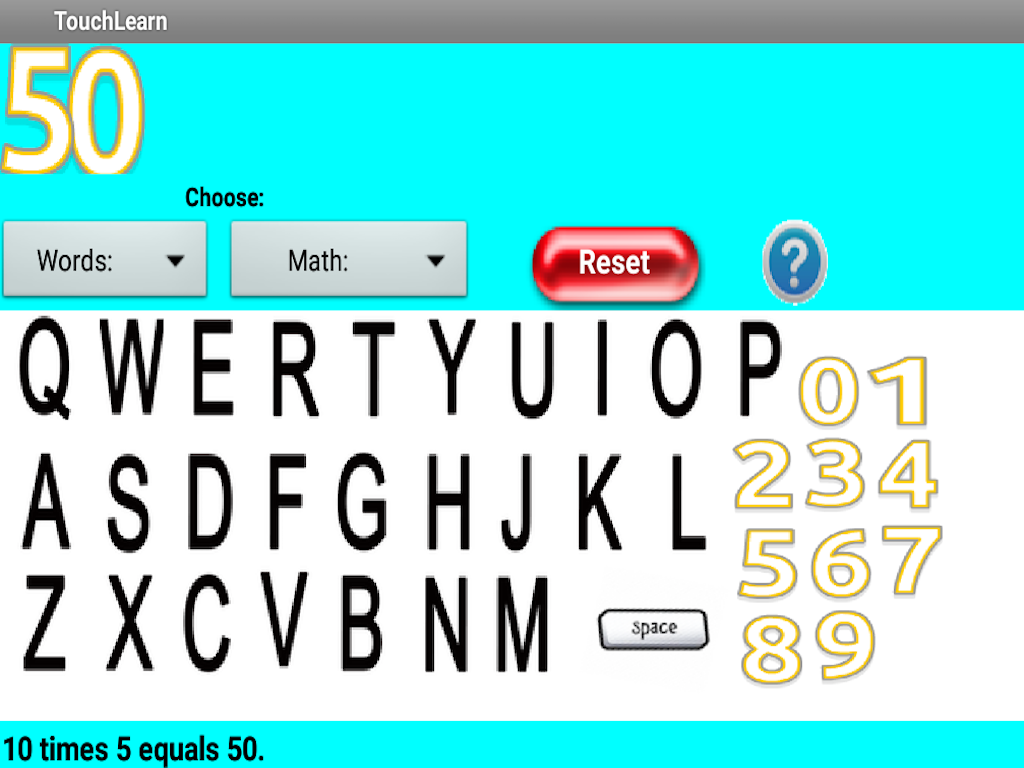 Tap on letters or numbers to answer Reading and Math questions as well as States and Capitals.