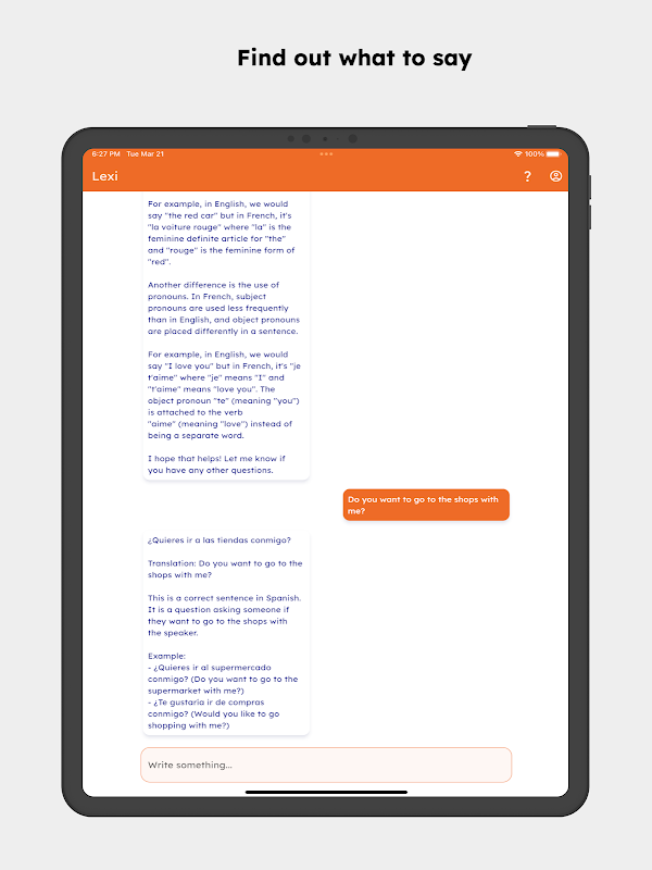 多語言:擁抱 Lexi 獨特的多語言功能,使您能夠毫不費力地在語言之間切換。從用西班牙語開始對話到用法語點餐,Lexi 都是您每一步的首選語言夥伴。