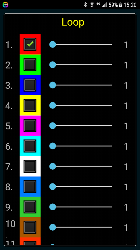 Loop mode: Select a flashing loop of up to 16 colors which flash from 1 to 10 times each, with a delay between repeating loops if desired.