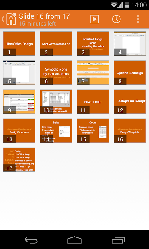 快來使用 LibreOffice 的免費簡報遙控 App!LibreOffice Impress Remote 可以讓您使用 Android 裝置來操控投影片放映 - 包括投影片預覽、講者備註... 等。