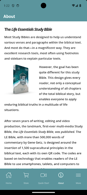 生命精華研究聖經包含1500原則通過連接到生活,從基因蓋茨的教學視頻。這個程序可以讓您在掃描研究聖經的QR碼或選擇單獨的原則,即時訪問1500教學視頻。通過使用這個程序,你就可以保存你喜歡的視頻,並跟踪哪些影片你看過。