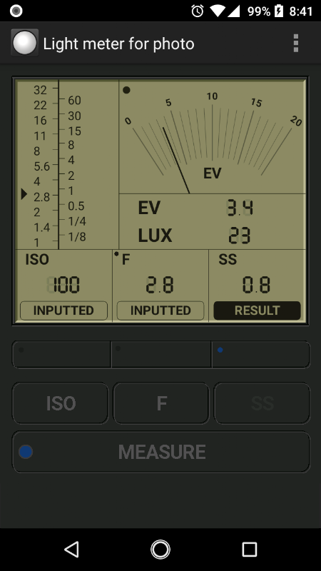 This app can measure 'F number' , 'Shutter speed' or 'ISO sensitivity'.