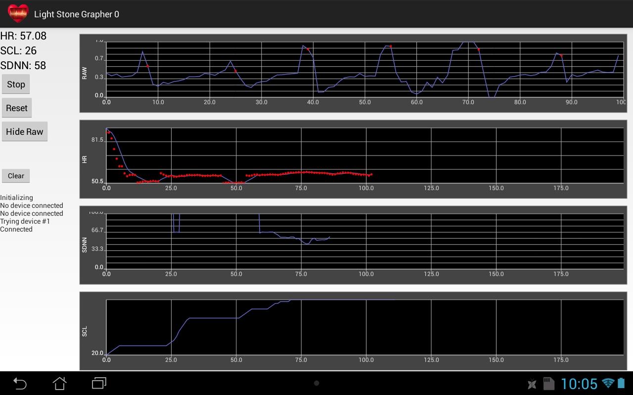 This app allows the usage of the LightStone device, from Wild Divine (http://www.wilddivine.com), with an Android device. App graphs Heart Rate, Skin Conductivity and Heart Rate Variability (HRV) standard deviation (SDNN)..