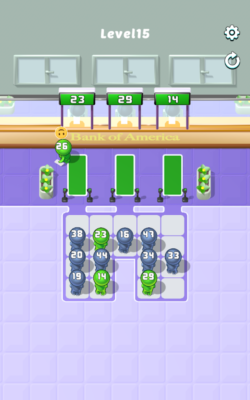 點擊並配對:在排隊拼圖中,您的目標是將顧客攜帶的號碼與相應的票房號碼相匹配。點擊具有正確號碼的客戶,將其發送給正確的櫃員。再次點擊您帶到綠色網格的顧客,並將他們引導至櫃員處。