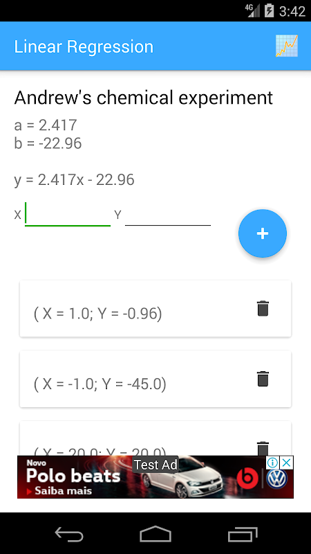 This application allows you to create several samples and, in each one, you just have to add the points (X and Y pairs) and the application will calculate all for you. It’ll calculate the A (inclination) and B (intersection), and you can even see the graphic plot with the points and the adjusted line.