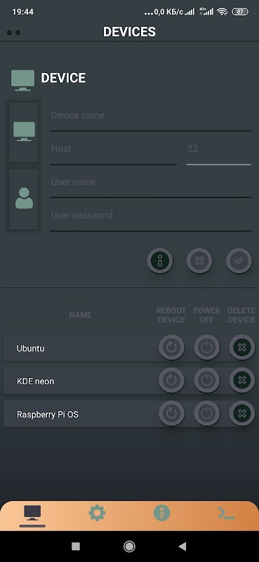 Working with the application is simple. It is necessary that the smartphone and the microcomputer are connected to the same Wi-Fi router (I use the smartphone itself as a Wi-Fi access point). The microcomputer must have an SSH server (there is a lot of information on the Internet on how to install it). Then you go into the application, enter the IP: Port login-password of the microcomputer. And you get the ability to quickly manage system daemons and add your own scripts to work with devices.