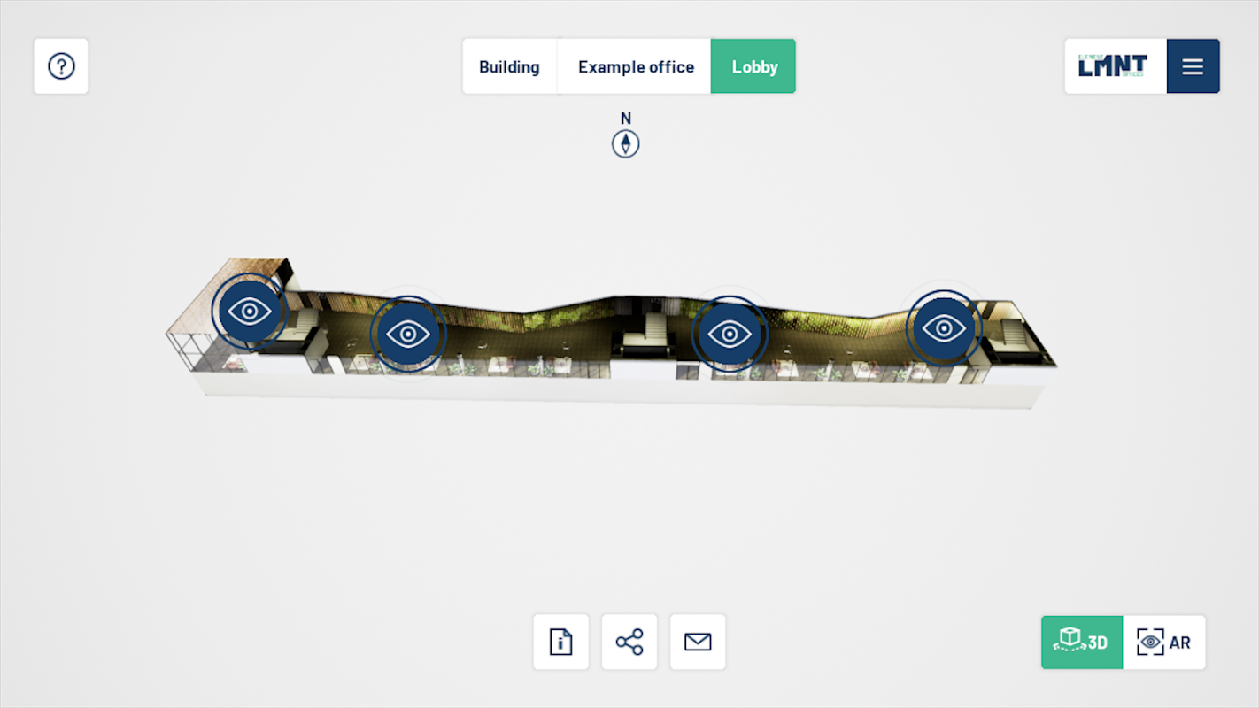 Mit der LMNT Offices Augmented Reality App haben Sie die Möglichkeit, das Bürogebäude LMNT – Element Offices dreidimensional vor sich aufzubauen und in die virtuelle 3D-Welt des Projektes einzutauchen.