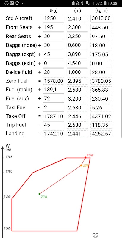 只需輸入飛行員,乘客,行李和燃料的各種重量值即可。