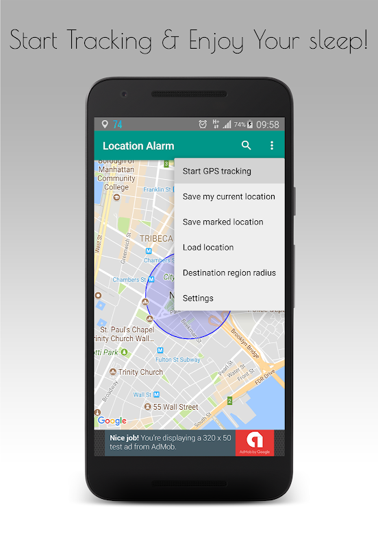 Location alarm app is a solution for people who sleep in bus, train, metro bus etc. and want to make sure to be woken when they are close to the destination. It is a location tracker with alarm that rings when the user entered into regions where the user specified for location tracking. Based on the location you marked on map, it tracks your location with GPS and wakes you up when you are close to your destination. The app is easy to use thanks to its simple design, just enter the address you want to commute on address bar, consider moving the marker on road map and start GPS alarm on the menu. You can even see the street view of the marked location which is a panoramic view of the street where you can make virtual tour on road, use this when you are unsure if you marked the arrival regions correctly. For use in long travels such as train travel, consider using big destination region in order to optimise battery consumption and achieve good accuracy. For frequently commuted routes, you can save and load locations using address book.