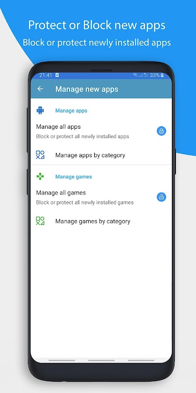 對於核心功能,您可以自動添加新應用。選擇要添加到特定類型的保護/鎖的應用程序類型,它們將在您安裝後立即添加。