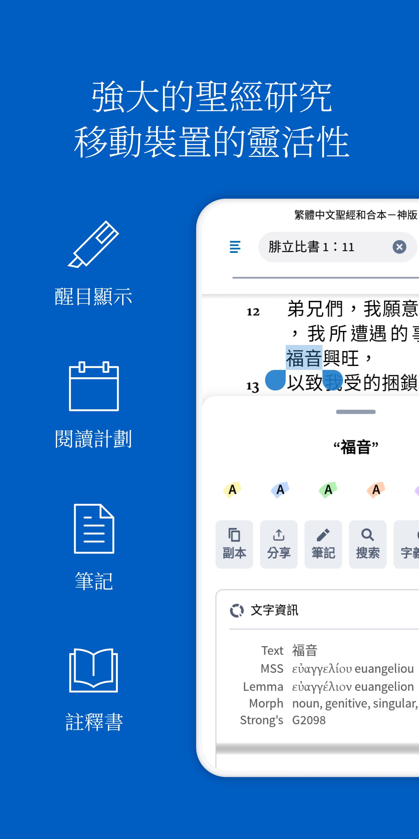 點選一個單詞或段落來標示醒目顯示,留下筆記,打開聖經研究,以及更多,所有這些都透過增強的文本選擇菜單來實現。