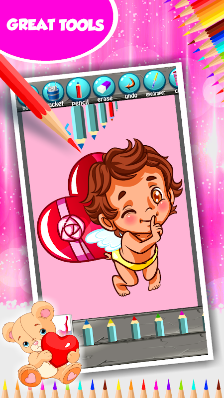 持有心形氣球的最可愛的泰迪熊將是情人節的完美禮物。去選擇圖片頁面,找到這個浪漫的毛絨玩具的插圖。然後使用手,以便您可以放大或縮小,以便即使是圖片的最細微細節也要注意。它必須是完美的,因為它將向你的寶貝傳達最重要的信息。也許你應該創建自己的形象?最新的愛情著色圖像是可能的。抓住您可以根據自己的需要調整大小的鉛筆。不要驚慌,如果你犯了一個錯誤,但使用橡皮擦來糾正它。此外,您可以簡單地塗鴉,這也是幼兒的完美活動。這樣就可以改善與這種教育遊戲的手眼協調。讓他們無情地畫線,也許他們會創造一些有趣的照片。保存您在畫廊中所做的工作,隨時隨地瀏覽您的作品。設置為最好的壁紙,並以令人印象深刻的方式裝飾您的平板電腦。下載免費的流行的愛著色書,這將成為你最喜歡的消遣一眨眼。
