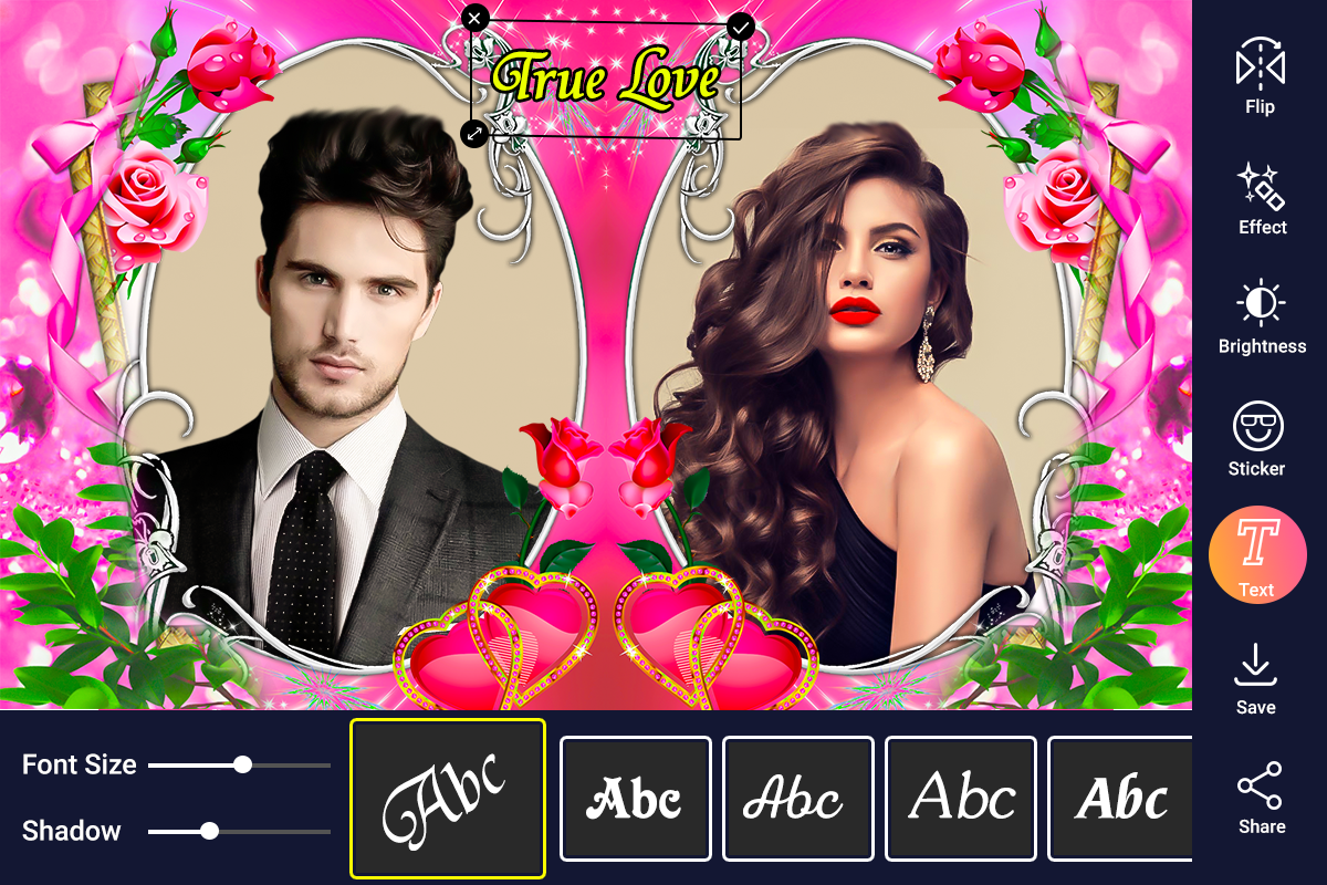 您可以將您和您的真愛的雙照片永遠設置在相框中,以製作浪漫情侶/真愛:相框。您還可以通過從移動圖庫中選擇照片來編輯帶有框架和其他照片效果的照片,或者您可以使用與框架一起直接單擊照片。