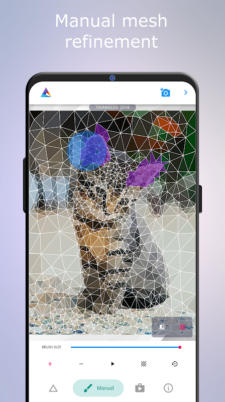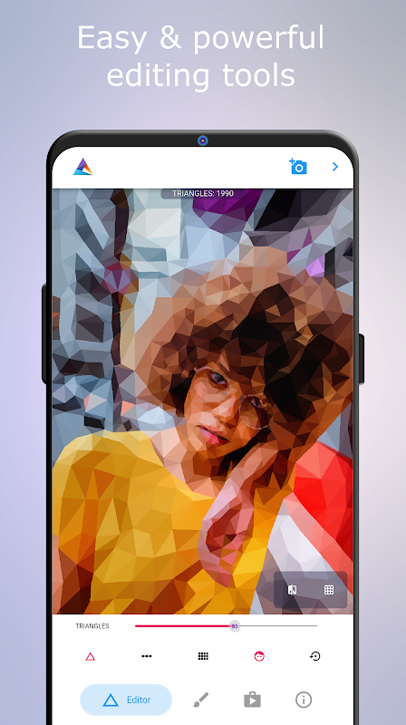 [低多邊形網格編輯器] 編輯器會根據您的照片自動產生高品質的低多邊形圖稿,讓您自訂: * 網格三角形的數量 * 網格的規則性 * 起始網格細分。