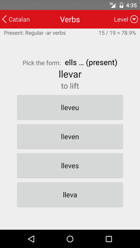 只要你有你的手機和一個免費的時刻,它提供了一個連續的多項選擇題測試在加泰羅尼亞語詞彙和動詞變位。你給每個答案被立即確認或糾正,你的知識是通過反复強化。穿插在這些是累積的水平檢討什麼在前面已經學會了。
