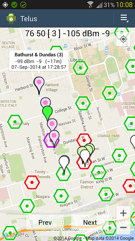 You can also display a Google Map, overlaid with the locations of all of the sites on a particularly Canadian LTE provider (which is presently Rogers, Bell Mobility, and Telus). This map will show your current location, as well as which site you are presently latched onto (if the ID of that site is known).
