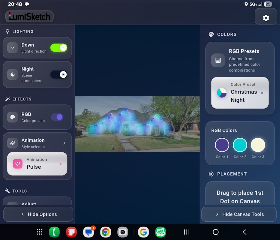 LumiSketch Mobile 是永久照明安裝人員、戶外裝飾師和創意專業人士的首選模型工具。上傳照片,點擊放置動畫 RGB 燈,可視化間距、顏色過渡和自訂圖案,然後將您的設計匯出為視頻,立即與客戶分享。
