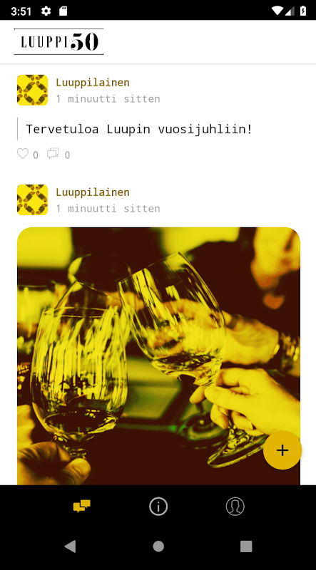 Luuppi50 sovelluksessa voit jakaa juhlatunnelmia muiden juhlijoiden kanssa, ja saada tietoa tapahtumasta.