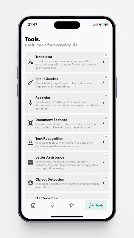 關注功能:Minimalistic AI的最新功能是文字摘要。只需選擇整個 PDF、Word 或 PowerPoint 文件,應用程式就會讀入它們。然後以清晰且結構化的方式總結整個內容,非常適合為學校、大學或工作等建立結構化學習範本。這項功能使理解和處理大量資訊變得更加容易,使學習和工作更有效率和有條理。