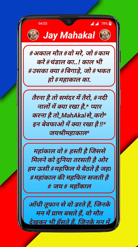 非常易於使用的界面只需左右滑動即可閱讀印地語中最好的實時 Mahakal 態度狀態,並輕鬆將其設置為您的印地語 WhatsApp 狀態或 FB Mahakal baba 狀態。