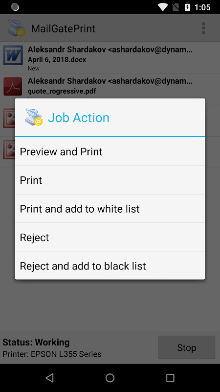 Once a print job is received from unknown address, it requires your approval. MailGatePrint maintains white and black lists. Sender’s address can be automatically added to the white list upon approval, or to the black list upon rejection.