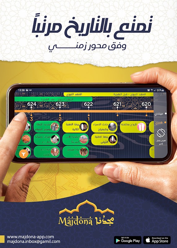 我們的Majdona(我們的榮耀)應用程序是此類應​​用程序中的第一個,它通過在一個簡單,協調的時間表中顯示歷史事件和紀元,以有趣而獨特的方式顯示伊斯蘭文明的歷史。具有搜索和篩選功能,此外還有一個特殊的部分,用於根據多個級別挑戰和檢查信息。