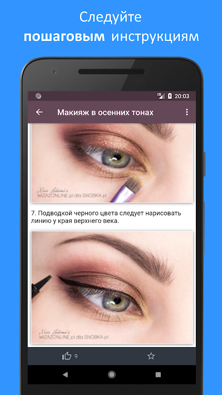 В приложении Вы найдете подробные уроки макияжа с иллюстрациями и описанием на любой вкус, фото уроки макияжа и большое количество идей макияжа глаз которые помогут Вам сделать прекрасный стильный образ.
